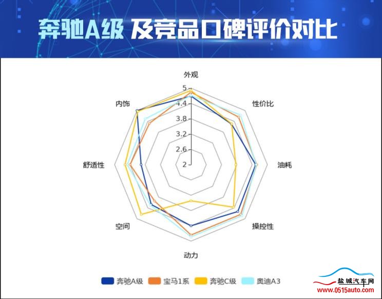 在竞品圈中,今年市场销量排名第2的奥迪A3,用户口碑总体评分为4.62,在竞品圈中总体评分最高,在这里市场销量与用户口碑有所背离。从用户评价来看,奥迪A3在动力、操控性方面用户评价较好,但在空间、舒适性方面有待提升。宝马1系口碑总体评分为4.54,位居口碑总体评分第二名,与奥迪A3相比,口碑总体评分差距不大,其在外观、动力方面较受用户青睐,但在空间、内饰方面评价一般,如在这些方面进行提升的话,有望获取更多用户。奔驰A级用户口碑排名第三,在舒适性、空间方面有一定劣势,需要进行提升以提高用户满意度。奔驰C级用户评分最低,对动力、油耗用户有较多不满,需优化产品,满足用户需求,提升产品竞争力。