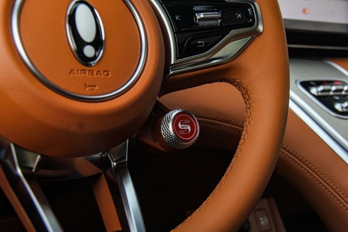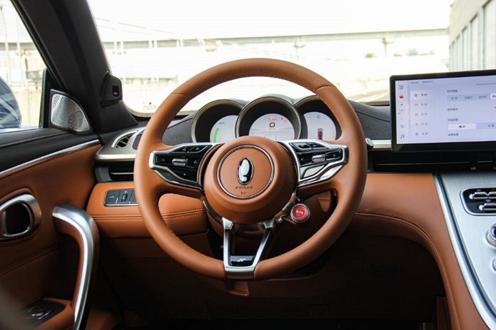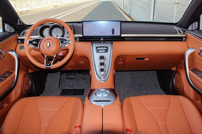 坐进闪电猫的车内,左右对称的中控台,依旧弥漫着浓浓的复古风格,T型中控台颇有经典性能车的感觉,主驾驶面前的3个炮筒式仪表,方向盘右下角的驾驶模式调节旋钮,几乎都是曾经我们所钟爱的性能车的样子。