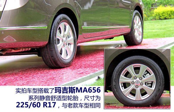 车身侧面唯一变动的地方就是这套新加入的7辐式铝合金轮毂,除此之外,镀铬条、后排车窗隐私玻璃等都保持原样。实拍车型搭载了来自玛吉斯的MA656系列静音舒适型轮胎,尺寸为225/60 R17,与老款相同。