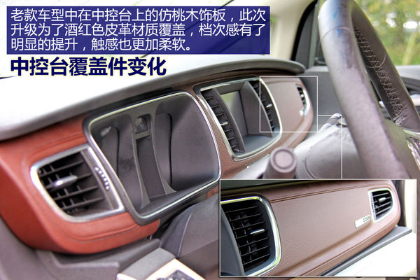 2014款别克GL8的中控台依旧采用了上深下浅的环抱式设计,这一区域的变化并不大,别克强调了GL8在座舱静音效果方面的进步,在舒适性方面下了很大功夫。老款车型中在中控台上的仿桃木饰板,此次升级为了酒红色皮革材质覆盖,档次感有了明显的提升,触感也更加柔软。