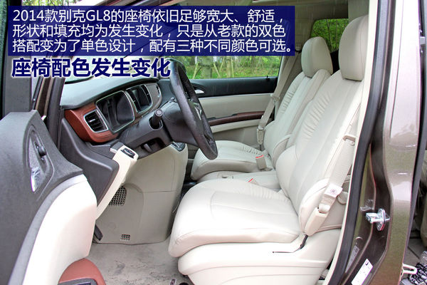 2014款别克GL8的座椅依旧足够宽大、舒适,形状和填充均为发生变化,只是从老款的双色搭配变为了单色设计,配有三种不同颜色可选(前排座椅主驾驶座8向电动调节、副驾驶4向电动调节)。2+2+3形式的座椅布局使得进出后排非常容易,顶配车型的第二盘座椅带有电动按摩功能。第三排座椅的实用性很强,配有两组三点式安全带和独立的空调出风口,第三排侧窗则在进入第二代车型时就无法打开了。