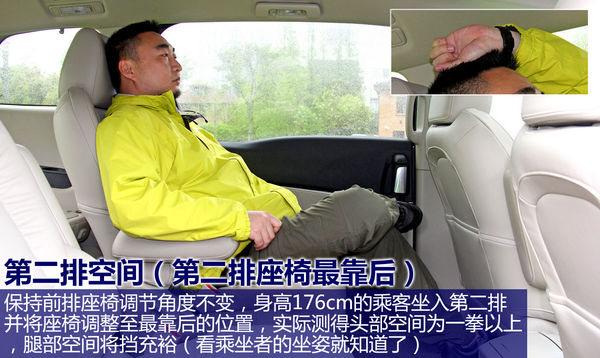 保持前排座椅调节角度不变,身高176cm的乘客坐入第二排并将座椅调整至最靠后的位置,实际测得头部空间为一拳以上,腿部空间将挡充裕(看乘坐者的坐姿就知道了);将第二排座椅调整至最靠前位置,实际测得腿部空间为一拳以上,实际感受依然很宽裕。