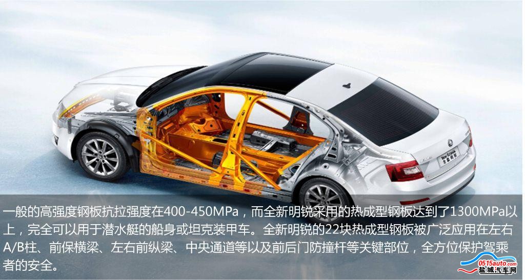 作为一款口碑出色的主流高端中级车,全新明锐车身74%采用高强度钢材打造,其中有22块抗拉强度达1300MPa的热成型钢材,在车身关键部位中占比为20%,大幅提升了车身强度和安全性。