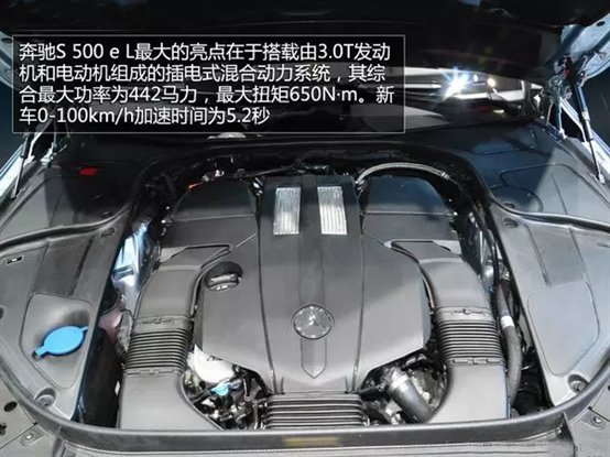 奔驰S500eL搭载由3.0T发动机和电动机组成的插电式混合动力系统,其综合最大功率为442Ps,最大扭矩650Nm。新车0-100km/h加速时间为5.2秒。奔驰S500 eL依靠纯电力驱动的续航里程为33km,在混动模式下,新车的最低油耗仅为2.8L/100km。