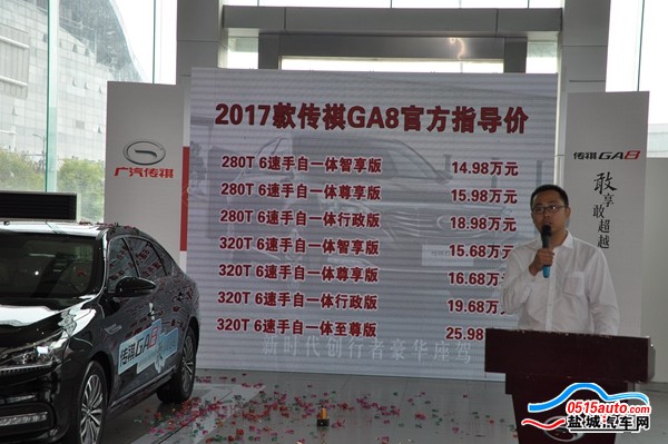 2017年5月20日,广汽传祺C级旗舰轿车GA82017款,在广汽传祺盐城和泰4S店正式上市。新车经过30项优化升级,新增280T动力,售价区间14.98万元-25.98万元,并享有同级罕有的5年/15万公里超长质保,为用户创造最优异的服务体验和最安心的用车感受!下面跟随小编的镜头回顾下广汽传祺GA82017款盐城地区上市会的活动现场。