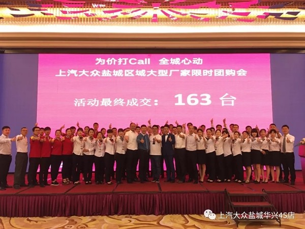 为价打Call  全城心动——上汽大众盐城区域大型厂家限时团购会已经完美收官,我们在这场集体的较量中,拼搏不已,奋勇向前。从前期宣传、活动筹备、再到活动结束,时间虽只有短短一周,在所有人的精诚协作下,本场团购会到达客户人数达600 ,最终斩获订单163台