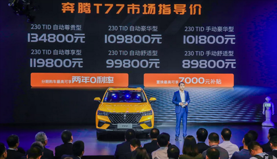 一汽轿车销售有限公司总经理孟祥会先生正式揭晓了奔腾T77的官方指导价。本次上市的奔腾T77共有六款车型,价格分别是: