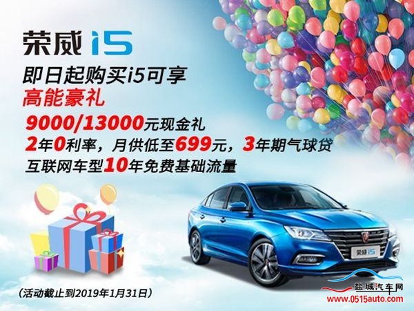 2019购荣威高能i5,全家期许一步到位,i5高能互联网中级车,集高能设计、高能动力、高能互联、高能空间、高能安全五大高能,还有荣威专属气球贷,让小梦想也能轻松实现,即日起至2019年1月31日购买荣威i5的用户,即可享受高能豪礼(不与现金优惠同时享受):现金礼:9000/13000元 智慧礼:互联网车型10年免费基础流量(价值约4000元)金融礼:2年零利率(价值约3000元) 轻松礼:月供低至699元,3年期气球贷等多种金融方案 2019购荣威i5,享受高能优质生活。 高能驾控:实现7.9秒级破百、35米刹停 高能安全:配置360°全景影像、ADAS 高能科技:拥有10.1英寸高清魅彩触控电容屏、12.13英寸液晶数字交互式组合仪表、搭载互联网汽车智能系统2.0 高能舒适:感受零重力豪华美臀座椅、超大后排空间高能设计:体现年轻律动情感设计语言、最美双曲灵跃腰线 你的期许,高能i5负责实现,诚挚邀请您和家人来店试乘试驾,体验i5智慧,领取i5豪礼(详情欢迎致电垂询)。