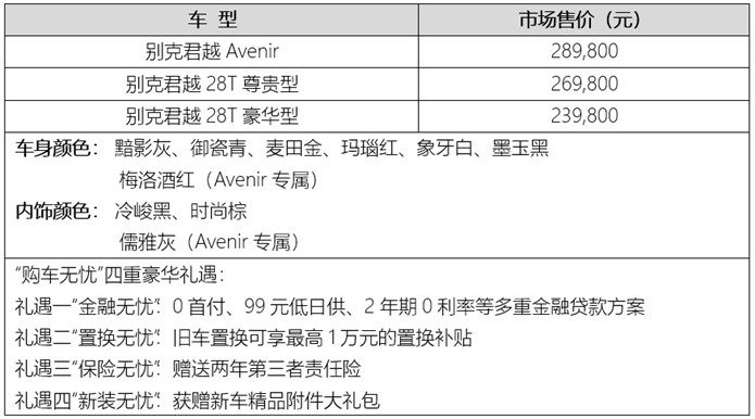 2019年3月29日 今天,上汽通用汽车别克品牌宣布全新别克君越及君越Avenir携手上市,共推出三款车型,提供七款车身颜色和三款内饰颜色,售价23.98万元-28.98万元。同时,购买全新君越可享受“购车无忧”四重豪华礼遇,全方位提升车主用车体验。作为别克中大型高档轿车的代表,全新君越领衔最新别克家族设计语言,引入通用汽车全新一代智能驱动系统,并搭载最新升级的别克eConnect 2.0互联技术,实现产品实力的全面革新。即日起,新车陆续到店并上市销售。