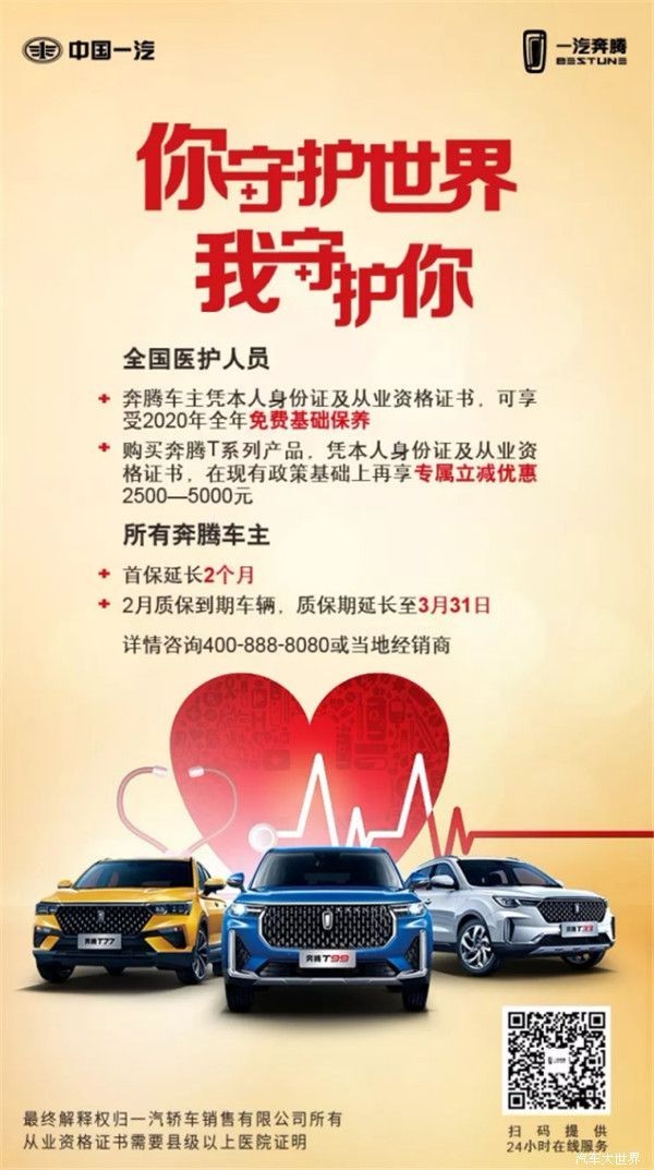 1、对医护人员车主的免费保养:对奔腾医护人员车主,凭本人身份证及从业资格证书,可享受2020年全年免费基础保养;