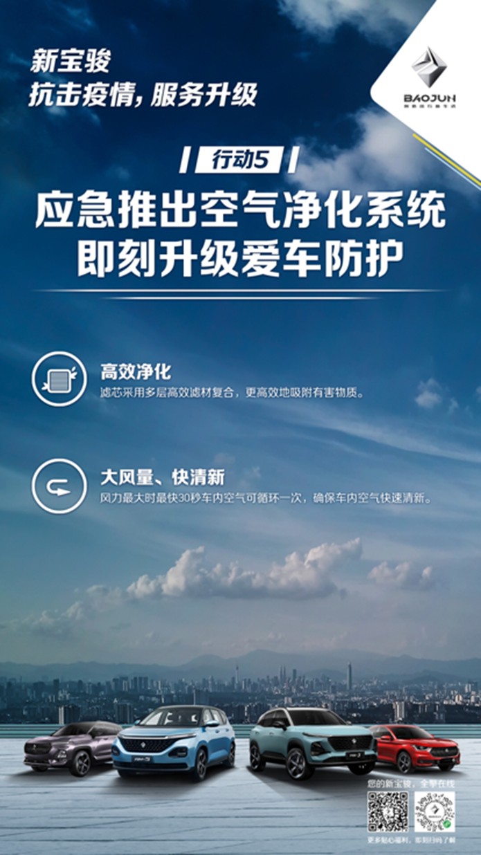 用科技先发安全防疫之声,以品质守护健康出行。新宝骏时刻走在防疫前线,通过软硬件升级等多方位措施将安全出行进行到底,在这场没有硝烟的战“疫”中,新宝骏与你一起,用洁净的空气共克时艰。