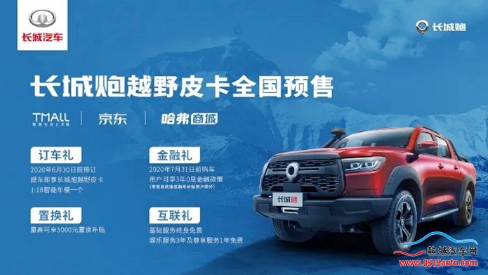 据了解,长城炮越野皮卡将于6月5日正式上市,并已全面开启预售。通过长城汽车全国各地专营店,或是长城汽车天猫/京东官方旗舰店、哈弗商城订车,只需要99元订金,就能享受四重大礼: