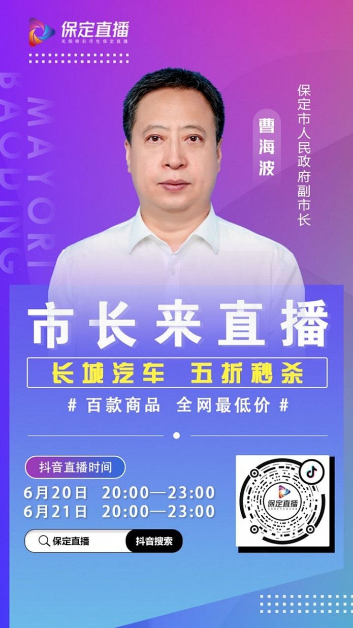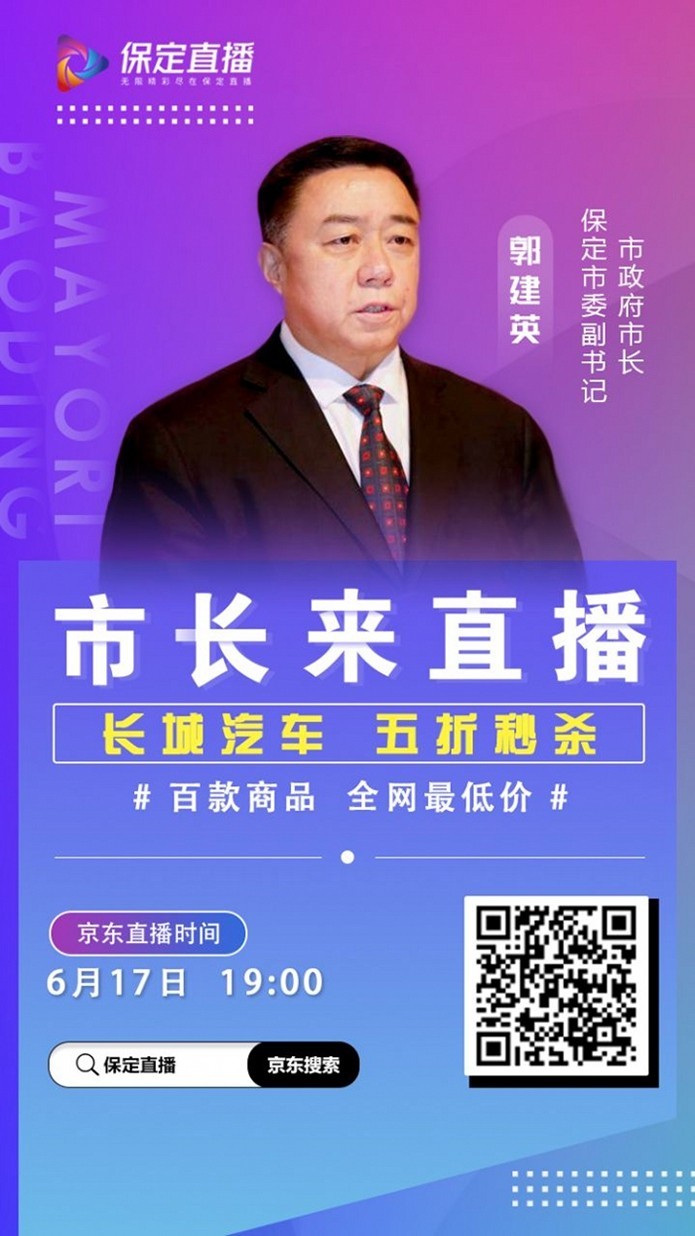 为推动保定经济发展,真正利企惠民,6月17日~21日,保定市市长郭建英将带领多位县(市、区)长共同走进直播间,成为主播,在保定·中关村创新中心向全国人民在线推介源于保定的长城汽车等知名品牌和特色产品。在此次“保定直播”活动中,长城汽车也将推出多款车型的限时半价秒杀活动及专属购车优惠,助力消费回暖。