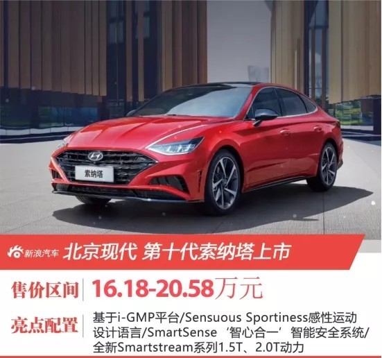 北京现代官方宣布全新第十代索纳塔正式上市,新车共5款车型,指导售价区间16.18-20.58万元。新车是现代汽车第三代i-GMP平台的首款车型,采用Sensuous Sportiness感性运动设计语言,搭载全新Smartstream系列1.5T 7DCT和2.0T 8AT两款动力组合。