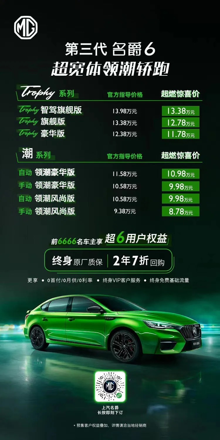 新车共推出7款车型,官方指导价9.38万-13.98万元,现在购买还可享受6000元上市现金红包,超燃惊喜价仅需8.78万-13.38万元。此外,前6666名车主还可享受"超6用户权益",包括终身原厂质保、2年7折回购,还可享0首付、0月供、0利率,以及终身VIP客户服务、终身免费基础流量。