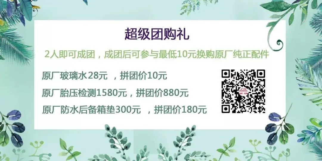 2人即可成团,成团后可参与最低10元换购原厂纯正配件。(原厂玻璃水28元,拼团价10元;原厂防水后备箱垫300元,拼团价180元;原厂胎压监测1580元,拼团价880元;终身免费机油VIP(蓝桶)2580,拼团价980元)