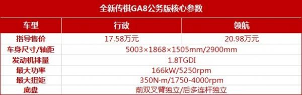 作为中国高端制造的代表,广汽传祺十数年如一日深耕行政公务市场。近期,旗下C级旗舰全新传祺GA8公务版亮相。新车共两款车型,搭载1.8TGDI动力,指导售价17.58万元起,充分满足“排量不超1.8L,价格不超18万元”的政策要求,进一步提升细分市场渗透能力。