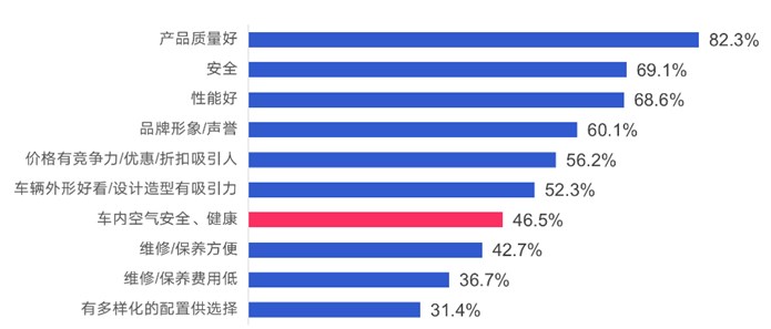 2021年3月初,J.D. Power(君迪)通过社交媒体发起了“新冠肺炎疫情对消费者购车意愿影响”的小调查。数据统计显示,中国消费者的前三大购车考虑因素是质量(82.3%)、安全(69.1%)和性能(68.6%),但疫情使车内空气安全和健康上升成为购车时的又一考量重点(46.5%)。