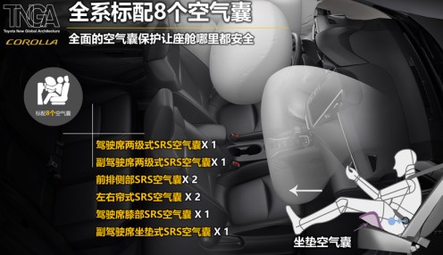既然TNGA如此厉害,那它究竟赋予了第十二代卡罗拉怎样的安全性能进阶呢?我们先从硬件方面,也就是通常统称为的“被动安全”,来探一探究竟。首先,第十二代卡罗拉采用了丰田GOA高刚性车身以及底盘加强筋、发动机舱顶巴式结构设计,锻造了一副高安全身骨,在碰撞发生时有效吸收碰撞能量保护座舱内安全;其次,在全系标配8个SRS空气囊、6大被动安全配置,以及TPMS胎压监测系统(带定位),有效提升驾乘人员的安全;同时,还在全系标配了CN95认证空调滤清器,大幅提升了后疫情时代,广大消费者更为在乎的车内空气安全和健康。