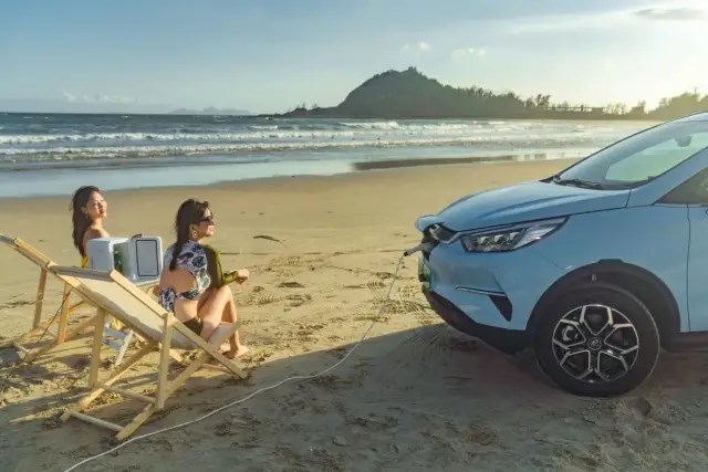 在沙滩这个没有电源的地方,元Pro的VTOL移动电站功能又大显身手啦,支持功率高达3.3kwh,我们轻松连接上小冰箱,冰爽的汽水与夏日海滩最般配。