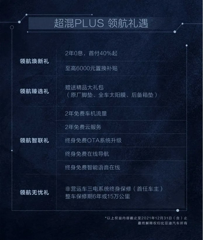 9月30日,比亚迪正式加推宋PLUS DM-i四驱版并定名为宋PLUS DM-i AWD,综合补贴后售价为19.98万元。比亚迪在广泛听取用户需求后,在宋PLUS DM-i“快、省、静、顺、绿”的超混优势基础上,加推四驱旗舰PLUS版车型,并提供日蚀蓝 苍穹灰及玄武黑 赤兔棕两种内饰配色选择,新车将于10月陆续到店,12月31日前购车,更尊享超混PLUS领航礼遇。