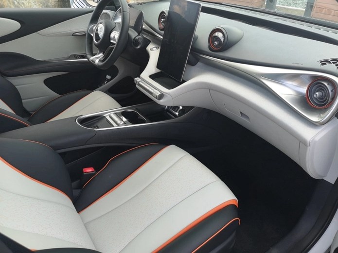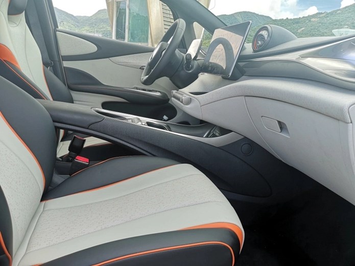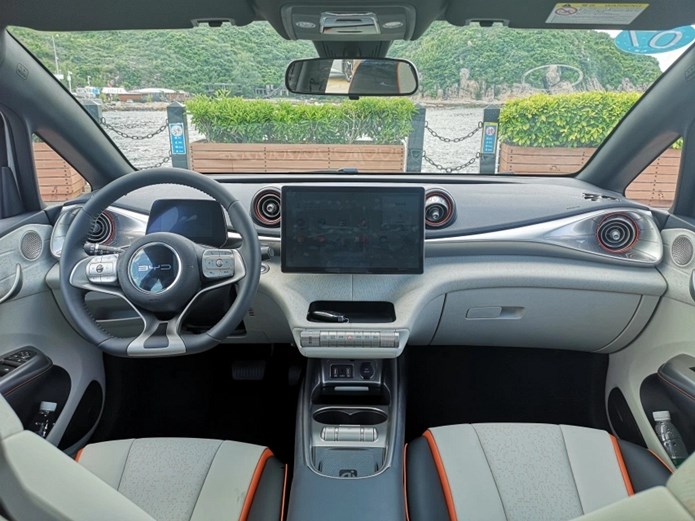 值得一提的是,比亚迪海豚的车身色调是内外统一的,以我们试驾的这台车(嘟嘟白-蜜蜜橙)为例,外观与内饰都点缀了大量橙色,既活泼,又协调。