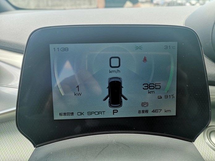 通过方向盘后方的悬浮式液晶仪表,可以随时查看驾驶模式、动能回馈模式、电量情况以及续航里程等信息,清晰而方便。