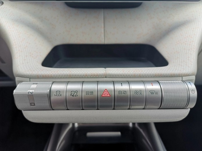海豚的驾驶模式有两种:ECO和SPORT。动能回馈模式有标准和较大模式。调节的方式很简单,中控屏下方有一排滚轮式的实体按键,驾驶模式、动能回馈模式,乃至空调、音量、双闪等常用的按键,都设计在了这一起,造型别致,体验感也很新鲜。