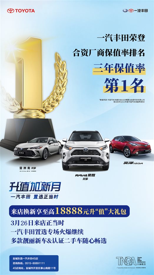 3月26日来盐城东昌一汽丰田购车置选您的爱车,至高享受价值18888元的升值大礼包。