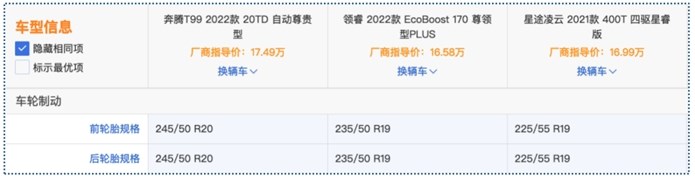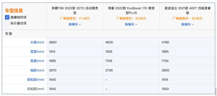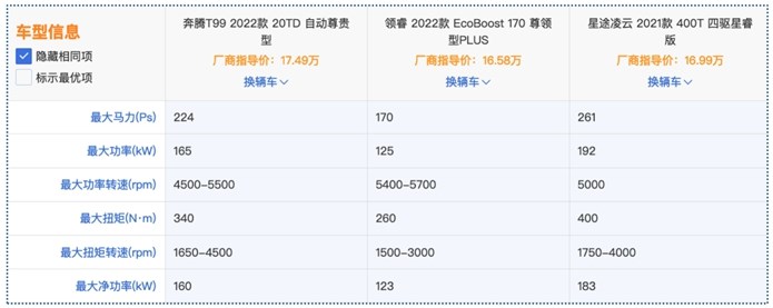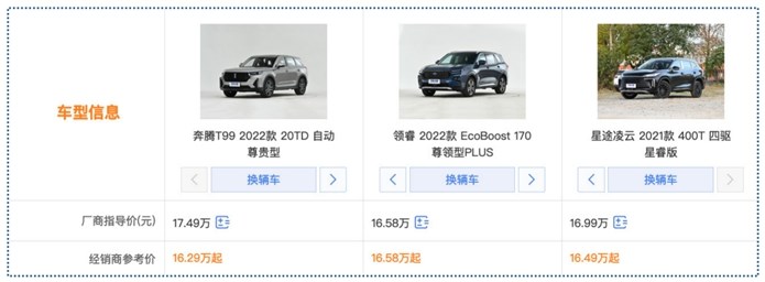 如果以16万左右的价格作为预算买SUV,放在从前,市面主流产量都集中在紧凑型的级别,但近几年随着竞争越来越激烈,不少打破级别局限的中型SUV将价格下探,以更庞大的体型更高的品质,形成“降维打击”,无疑,对于追求“大车”的消费者来说相当友好。今天我们就对比三款中型SUV奔腾T99 20TD 自动尊享型、福特领睿EcoBoost 170尊领型PLUS、星途凌云400T四驱星瑞版,看看在16万左右(经销商参考价)的价格,怎么买质价比最高。