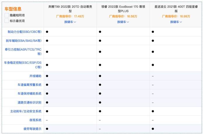 首先看主被动安全配置,三款车差异如下图。奔腾T99和福特领睿搭载的配置很丰富,但奔腾T99多出了疲劳驾驶提醒,这一功能可实时监测驾驶者的面部表情,如有打哈欠、闭眼睛等行为时,系统便会采取语音警示等措施提醒驾驶者注意休息,降低事故发生率,提升行车时的安全。而相比于前两者,星途凌云缺失了不少功能。