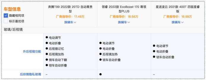 其次,在细节配置上,奔腾T99的外后视镜支持电动调节、折叠、记忆等,还可以加热,雨天或是冬季,可让行车视线免受干扰;福特领睿是三款车中唯一具备后排隐私玻璃的车型。
