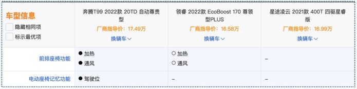 配置是否丰富,可以说是当下用户购车最为关注的地方,三款车的基础配置都是足够的,差异主要集中在更高阶的配置上。其中,奔腾T99和福特领睿最全面,时下主流的配置基本都有包含。