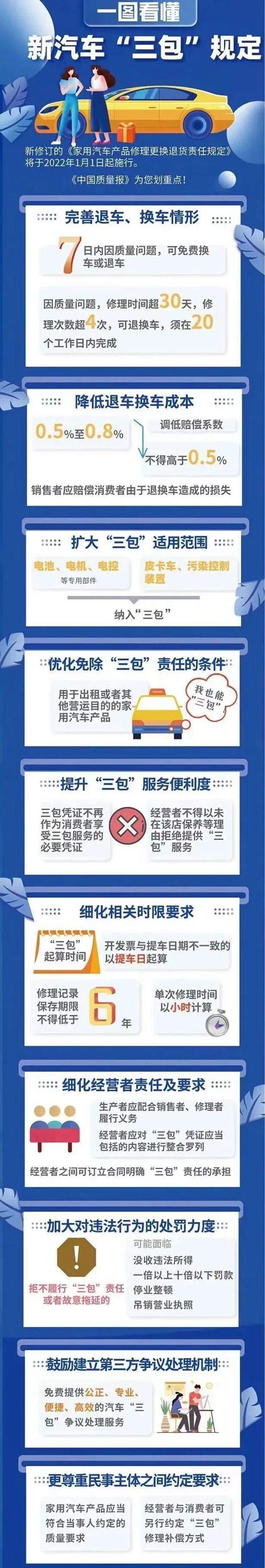 培训会上,三包专家左长春详细解读了“新三包”规定,强调了新版规定中的重要内容。一是明确三包有效期和保修期的计算方式。二是质量问题7日内可退换。三是退换车赔偿更具体。四是首次引入新能源相关条款。五是明确规定修理记录的最低保存年限。六是对生产者的要求提高。七是加大违法行为处罚力度,对故意拖延或无正当理由拒绝承担三包责任的经营者,明确依照消费者权益保护法的有关规定实施处罚。