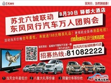 刚从东风风行厂家了解到2015年8月30日下午14:00在江苏盐城驿都金陵大酒店一楼驿都厅,东风风行厂家和江苏省六市七家经销商将联合举办“六城联动 0利风暴——风行汽车苏北万人团购会”大型活动,届时东风风行全系车型都将参与该活动。此次活动是风行汽车在江苏省内一次厂家直销,活动“限时、限量、限价“;绝对的惊喜价!全年最佳购车机会,错过了,就没有了!现场厂家领导将与来宾朋友们互动,精彩的节目表演,现场专属砸金蛋、订车抽大奖等等,当然最重要的是怎么能错过当天给力的团购政策呢?!